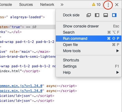 Open the developer tools and click the three dots in the upper right corner. From the drop-down, choose "Run command."